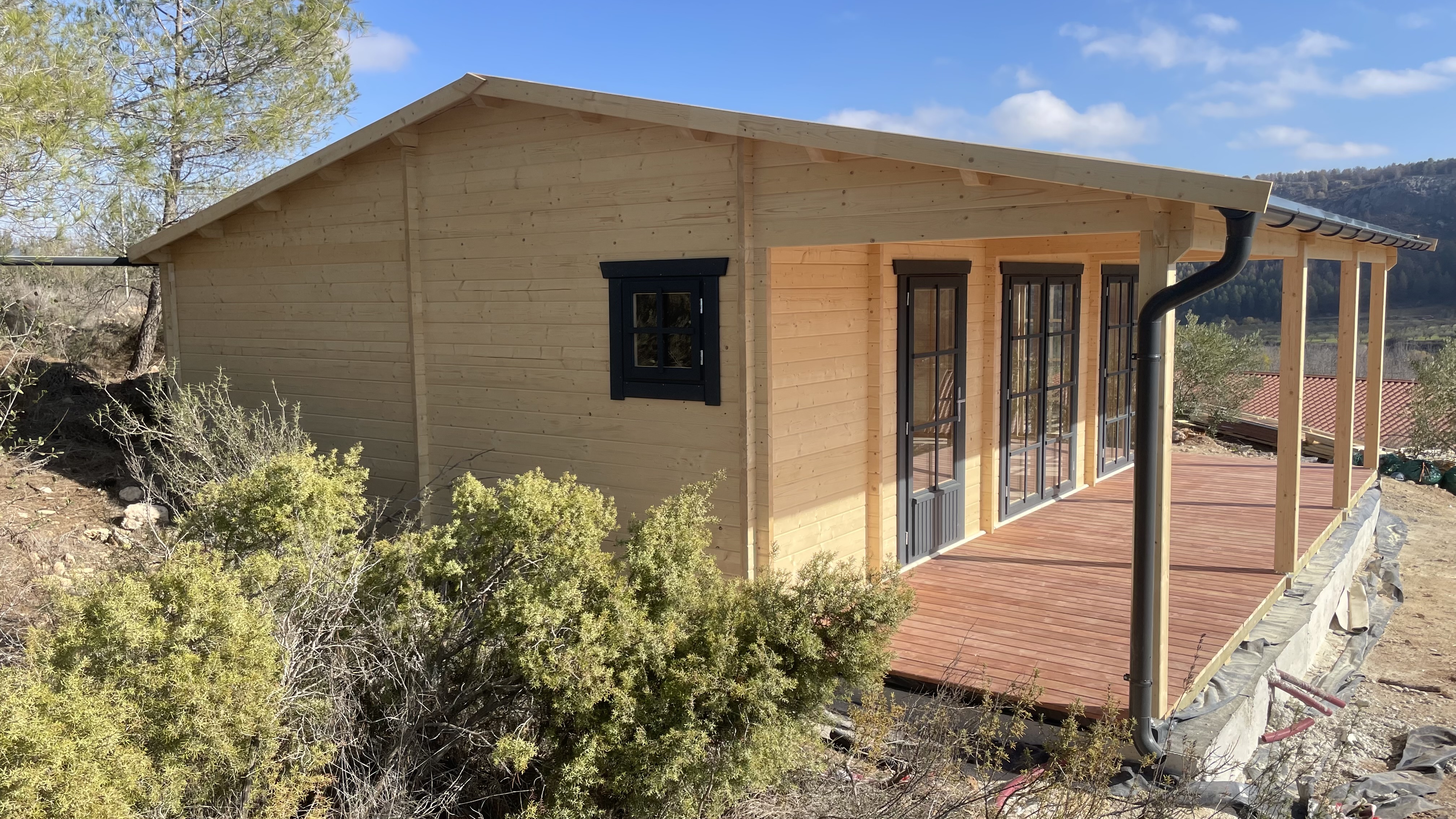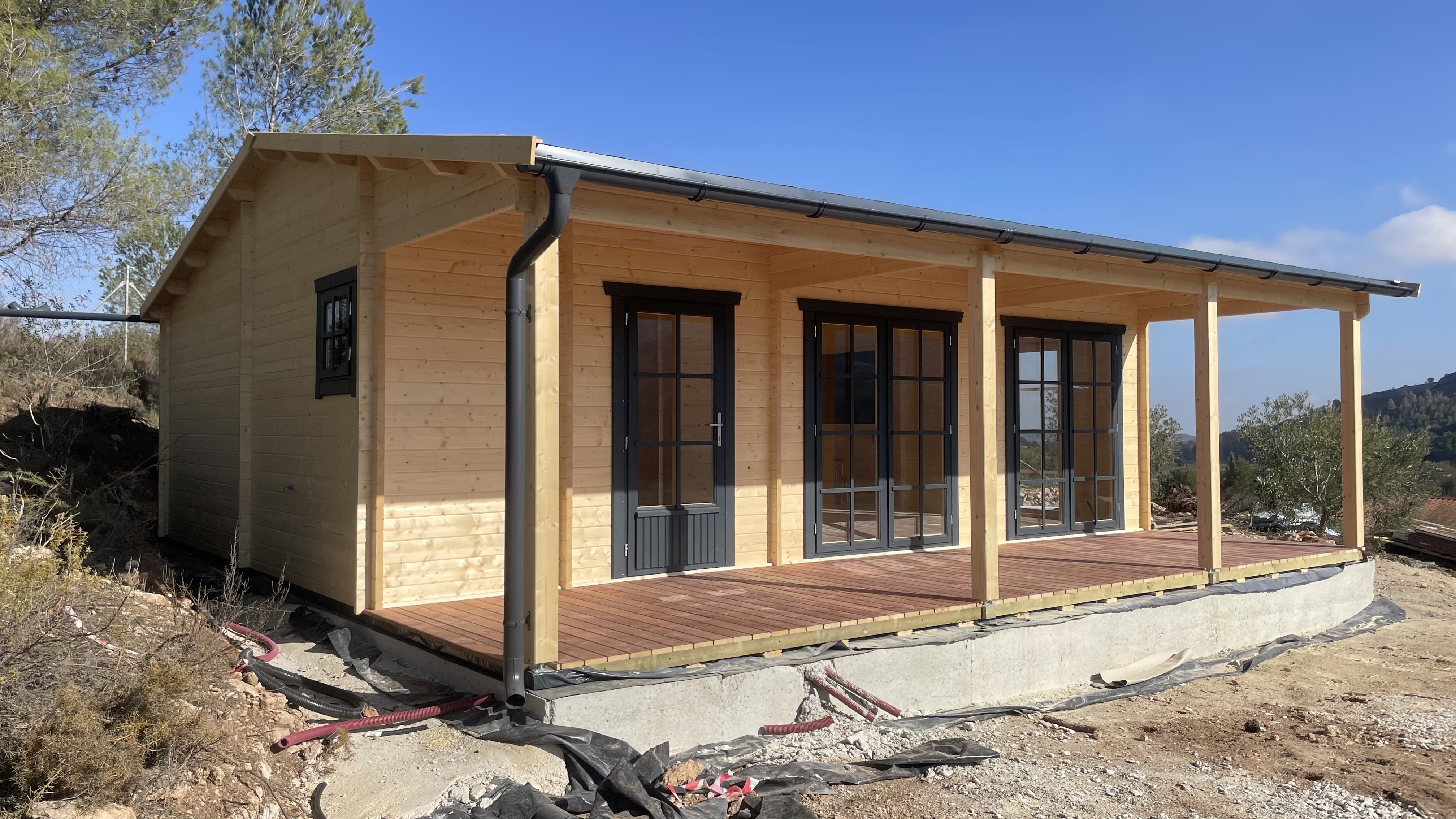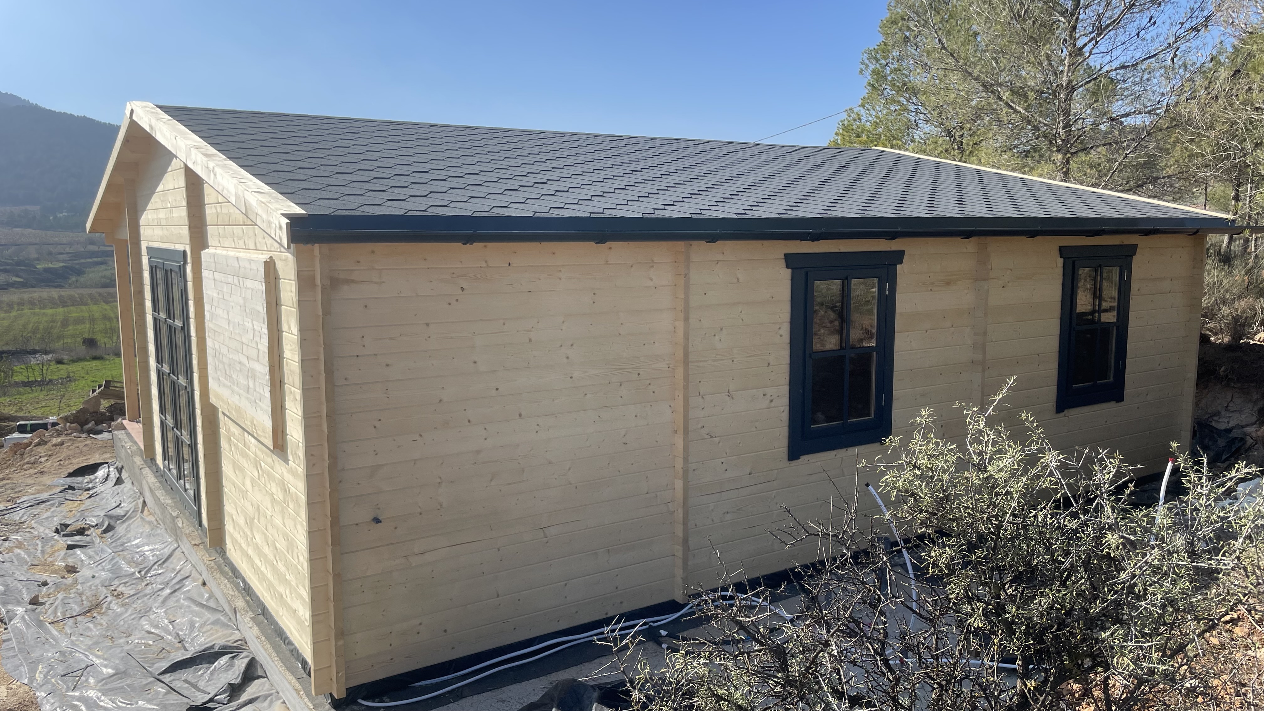 Miguel Angel DUERO 44 es una casa de madera moderna con terraza, que combina estética y funcionalidad. La estructura principal mide 8×6 m y cuenta con una terraza de 2×8 m ya instalada. Está construida con madera laminada perfilada de 44 mm, sin aislamiento en las paredes, con techo cubierto de tejas bituminosas y suelo aislado con lana mineral de 5 cm. El diseño interior incluye dos dormitorios, una sala de estar con cocina y un baño. Gracias a la distribución estratégica de las ventanas, el interior recibe mucha luz natural. La terraza amplia es perfecta para relajarse al aire libre.