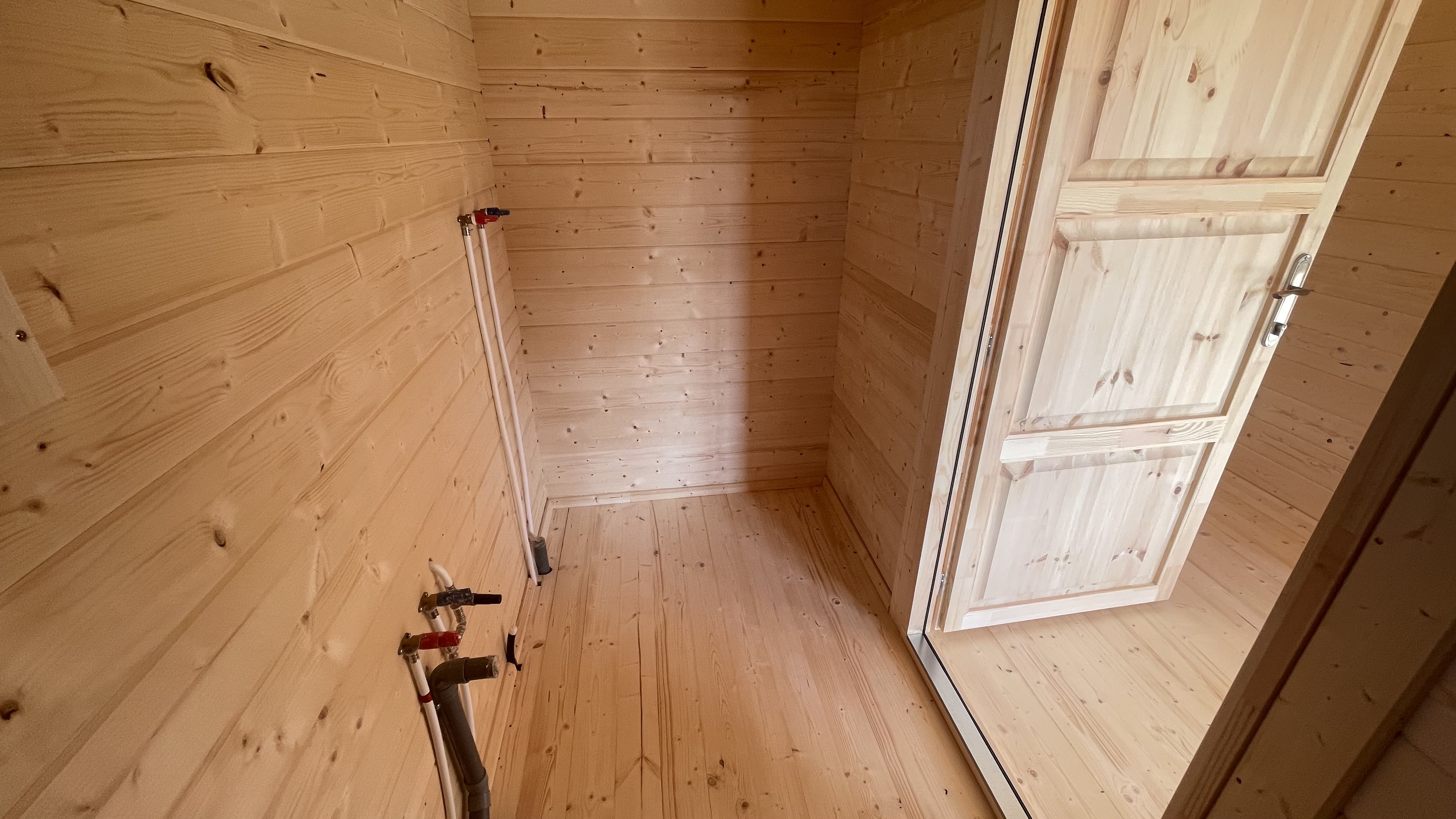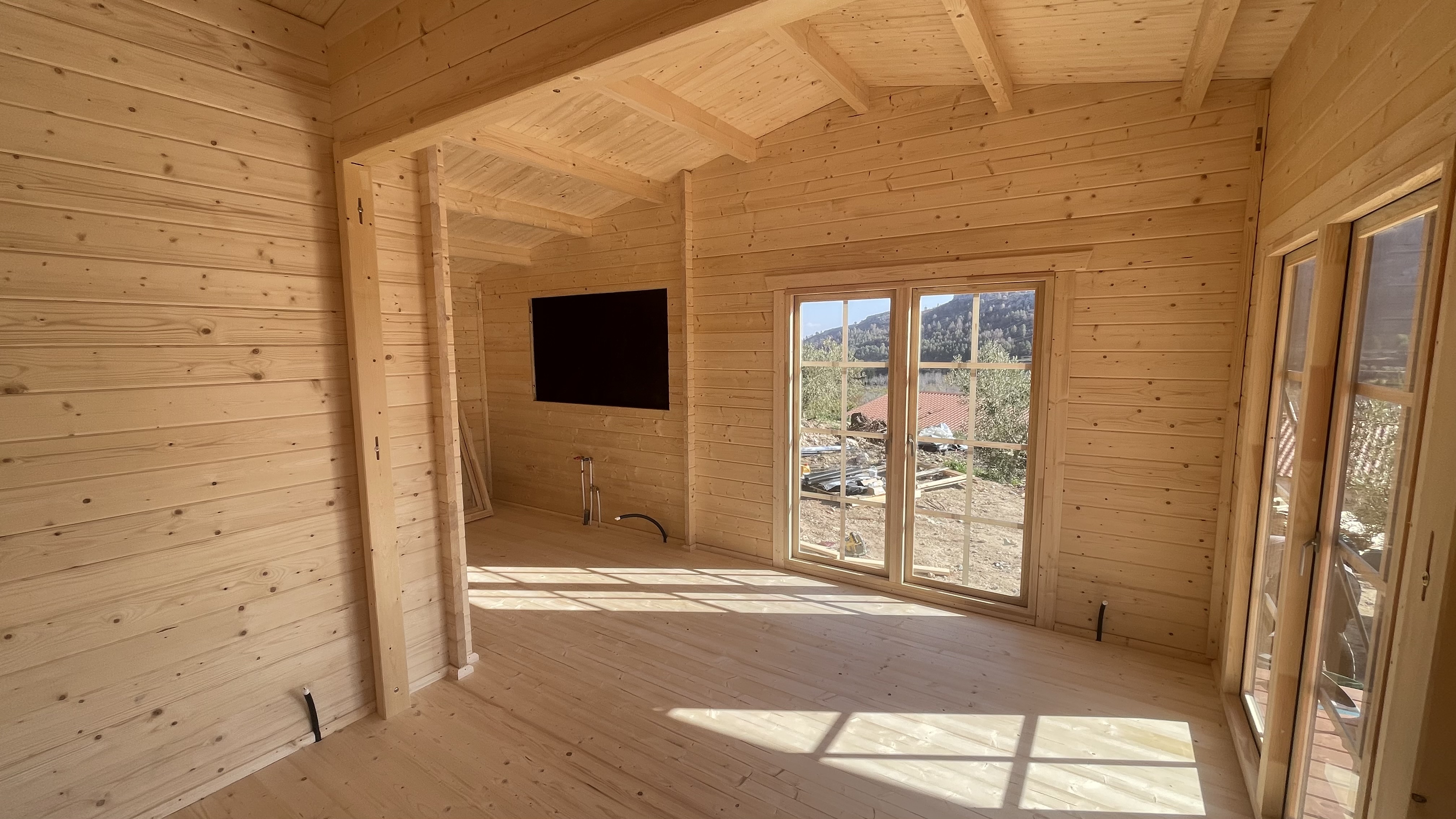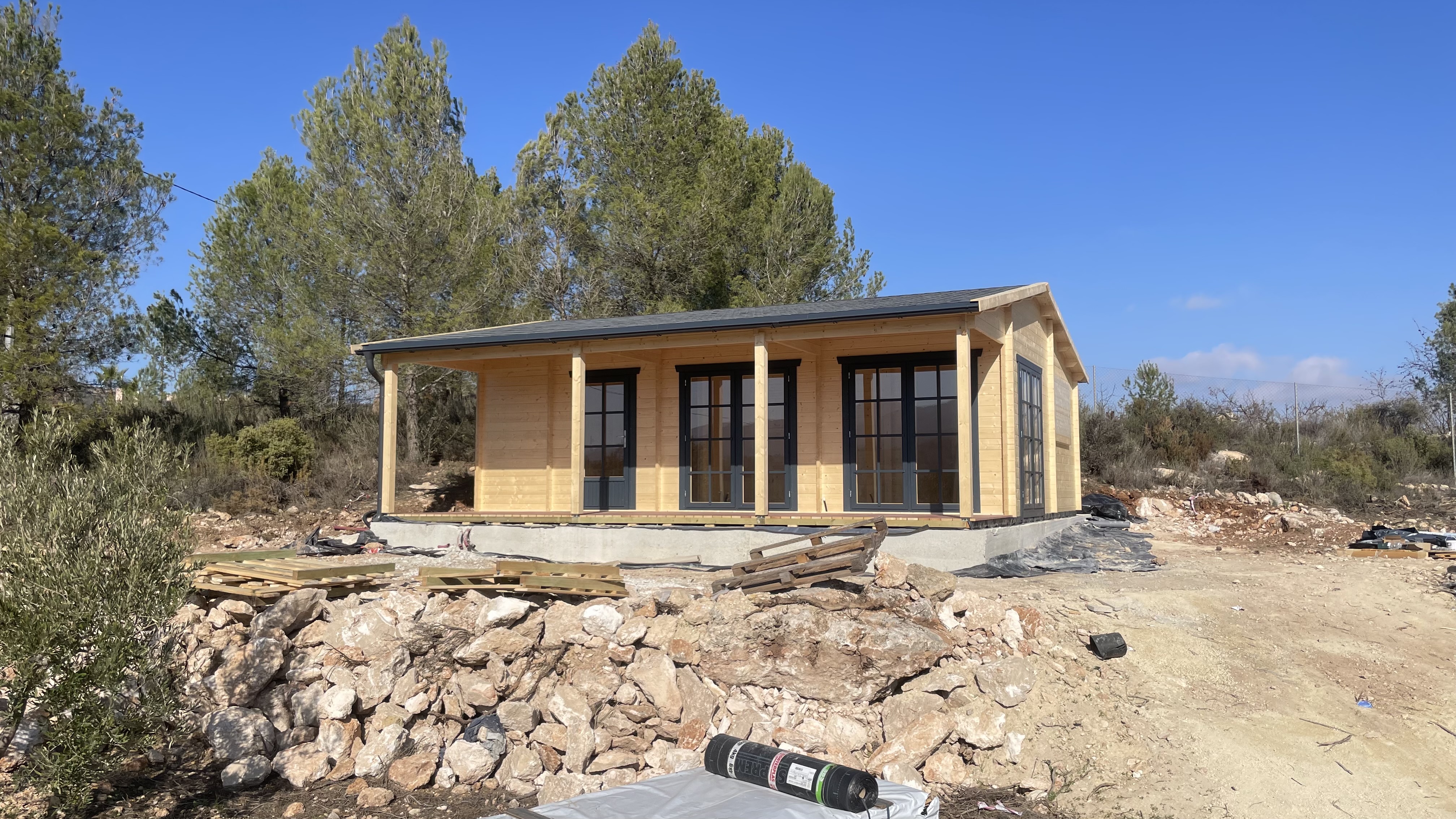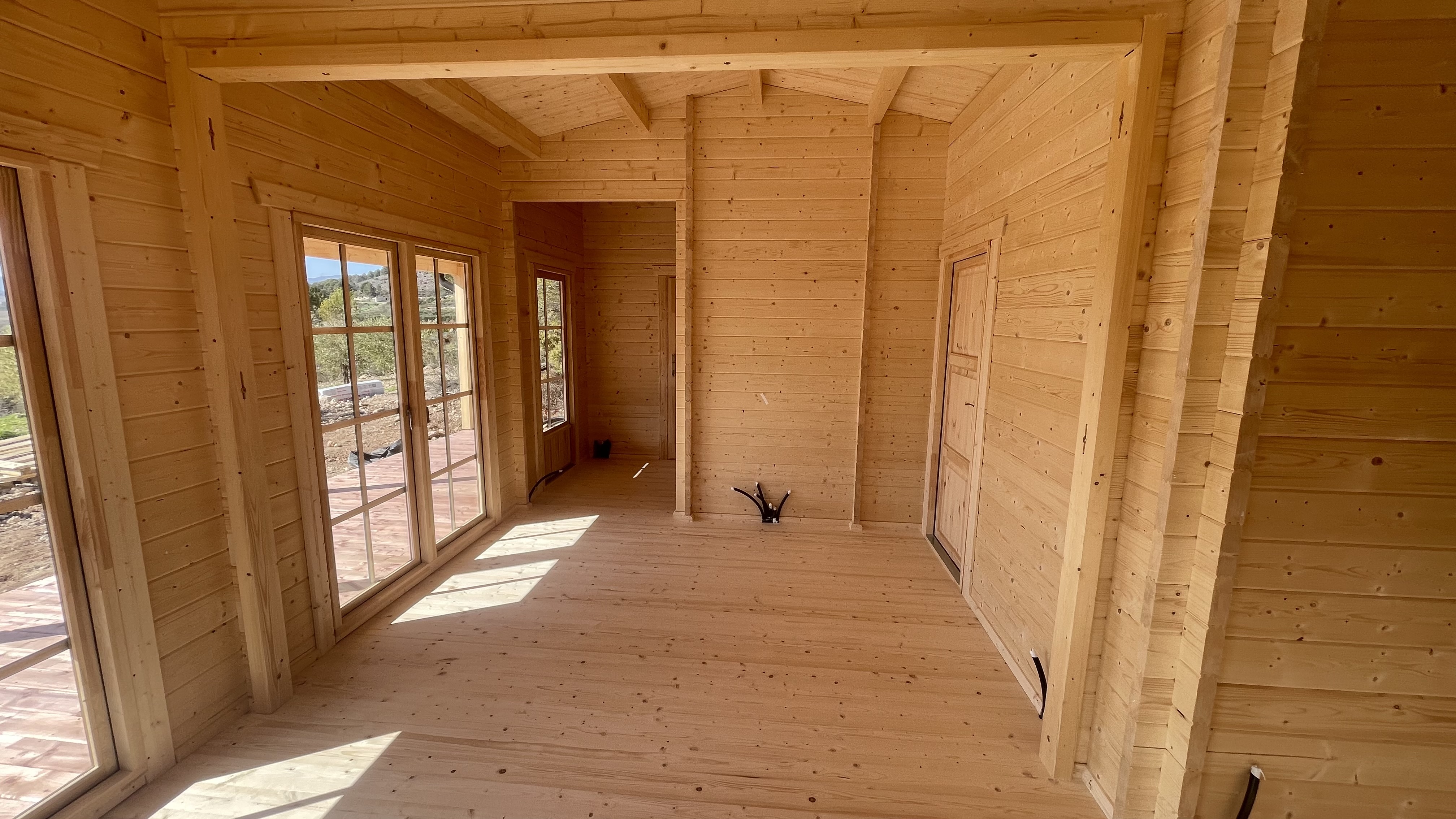 Miguel Angel DUERO 44 es una casa de madera moderna con terraza, que combina estética y funcionalidad. La estructura principal mide 8×6 m y cuenta con una terraza de 2×8 m ya instalada. Está construida con madera laminada perfilada de 44 mm, sin aislamiento en las paredes, con techo cubierto de tejas bituminosas y suelo aislado con lana mineral de 5 cm. El diseño interior incluye dos dormitorios, una sala de estar con cocina y un baño. Gracias a la distribución estratégica de las ventanas, el interior recibe mucha luz natural. La terraza amplia es perfecta para relajarse al aire libre.